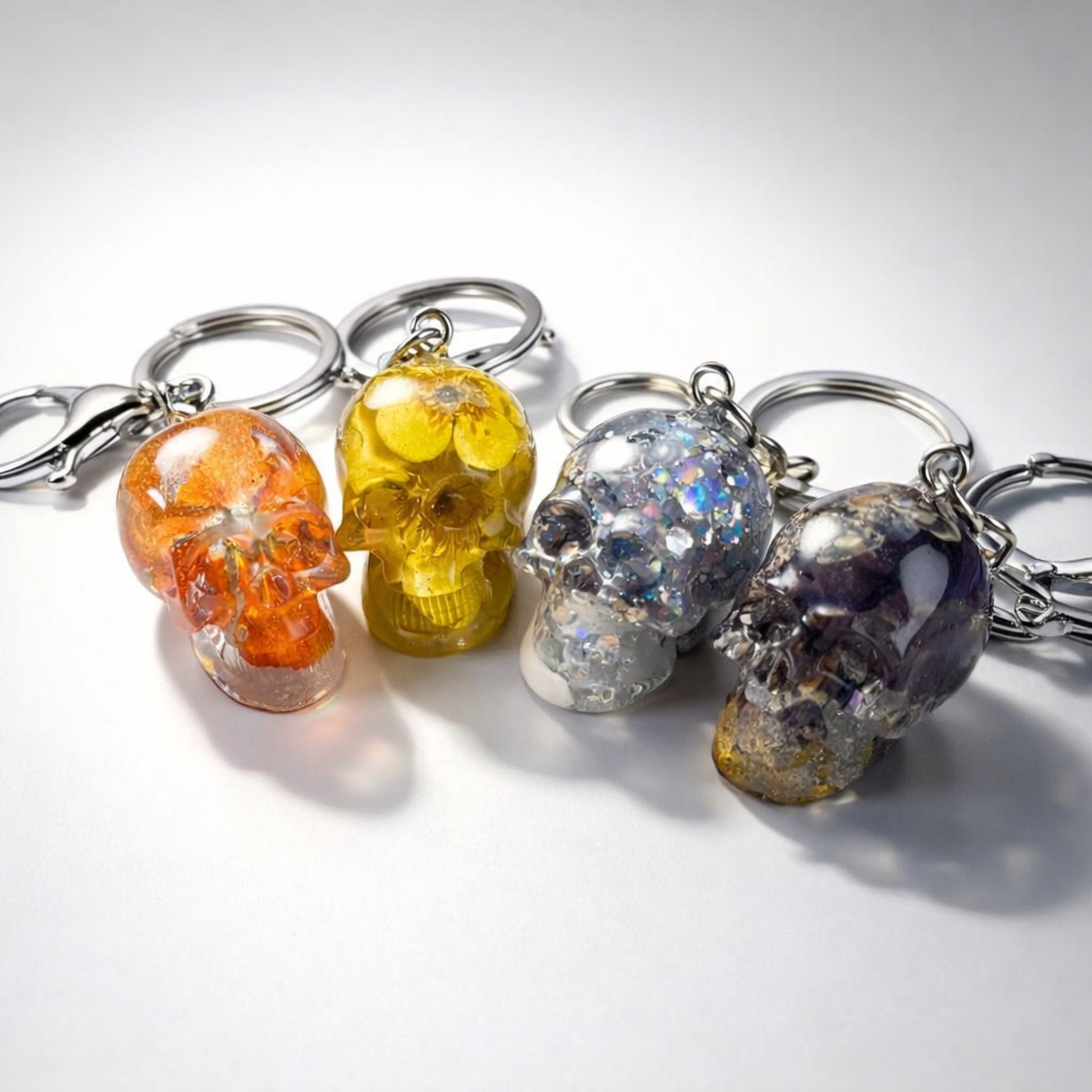 Håndlaget nøkkelhank av ekte blindrer støpt i glitrende kunstharpiks (resin), formet som en hodeskalle 💀