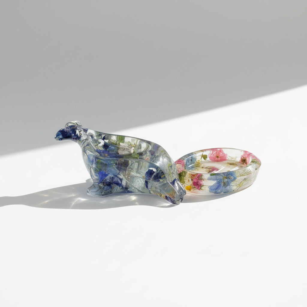 Blomstene er tørket og deretter innkapslet i krystallklar kunstharpiks (resin), støpt lag for lag for å gi både styrke og varighet. Overflaten blir glatt og glassklar, og gir såpeskålen et nesten skulpturelt preg. Resultatet er et funksjonelt kunstobjekt der botanisk materiale, håndverk og form møter hverandre i et robust og varig uttrykk.
