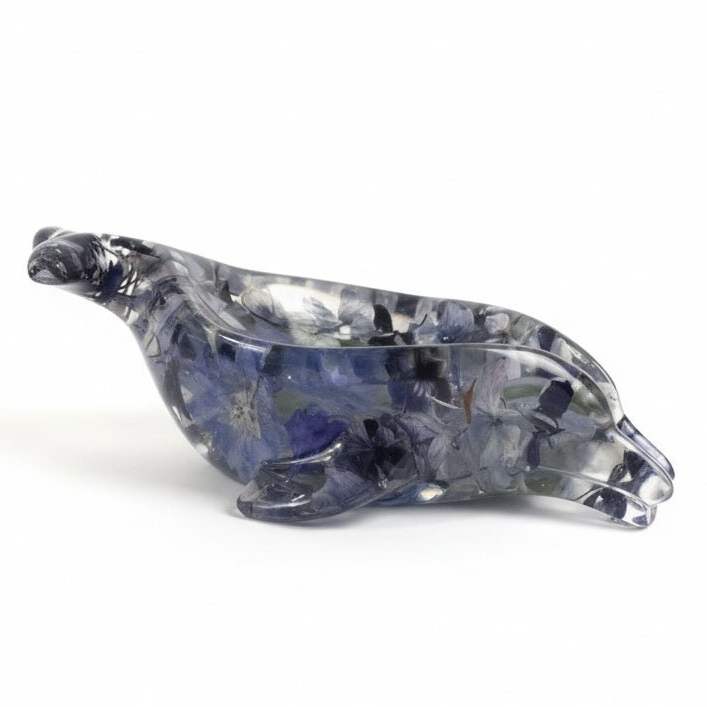 Denne såpeskålen er støpt i en generøs størrelse, ca. 21 × 11 cm, og har en tydelig tyngde som gjør at den ligger stabilt og stødig på benken. Formen av en svømmende delfin gir et mykt, organisk uttrykk, mens de ekte blomstene ser ut til å sveve inne i materialet som i klart vann. Blå delfinium, Anzio-klokker og hortensia i forskjellige blåtoner skaper et akvatisk fargespill med nyanser som minner om hav, bevegelse og lys, der både kronbladenes struktur og blomstenes naturlige årer er bevart i detalj.