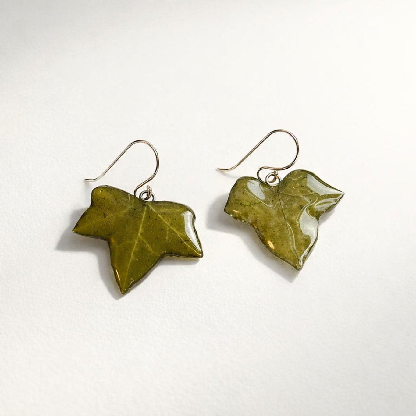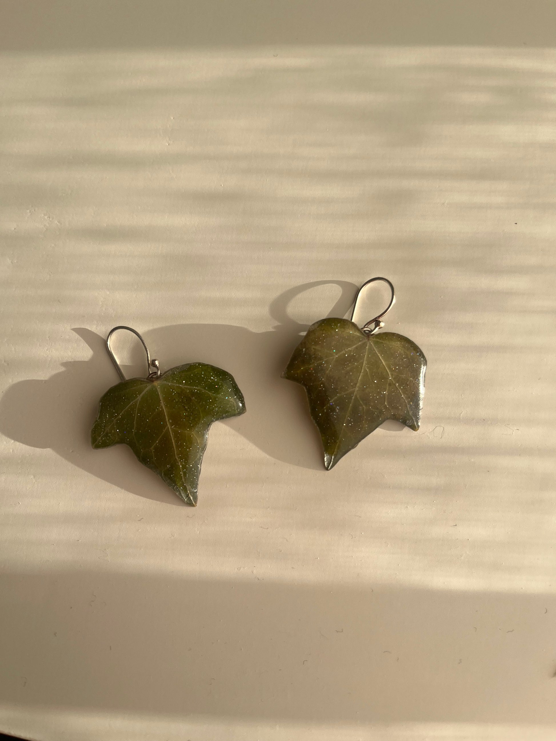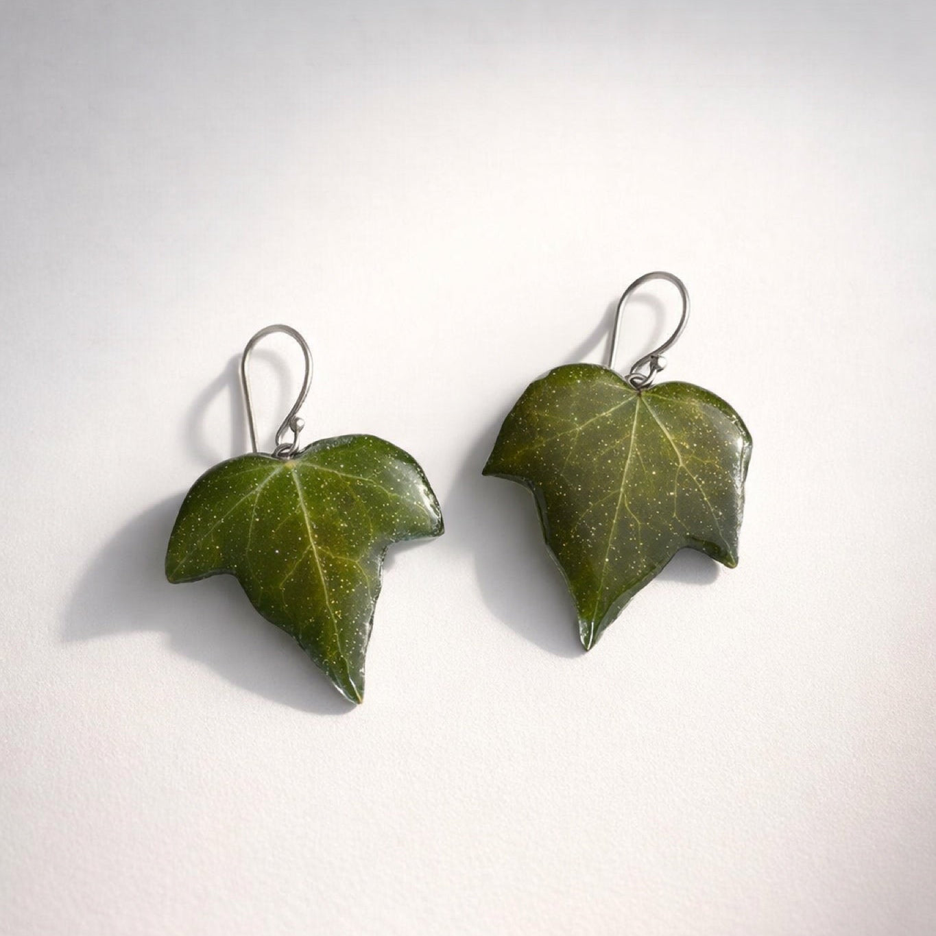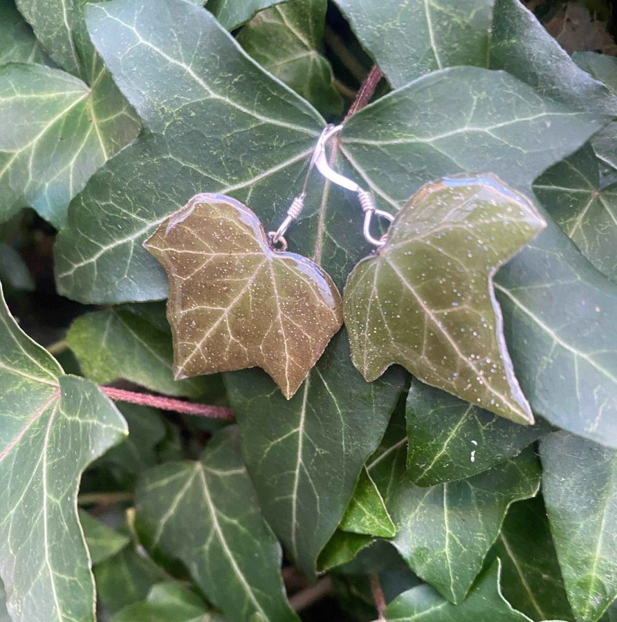 De grasiøse eføybladene er tørket og støpt i glansfull kunstharpiks, slik at deres autentiske skogsgrønne toner stråler med et hint av holografisk glitter.