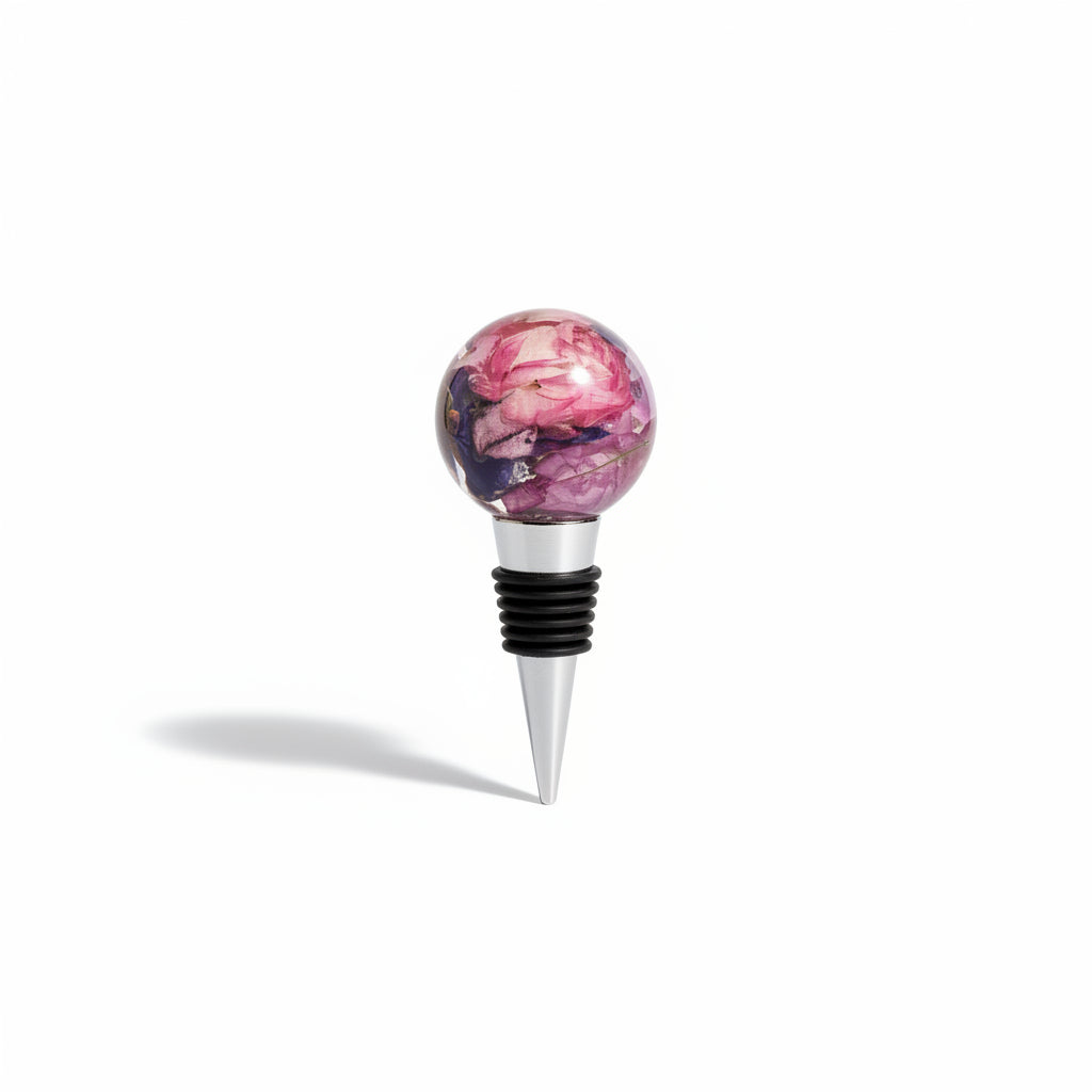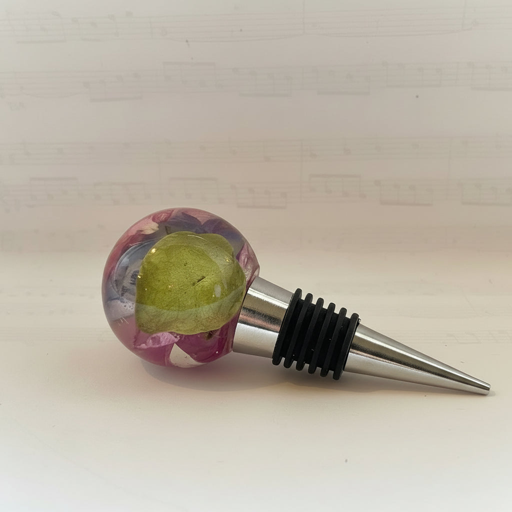 Denne vinstopperen er formet som en klar, rund kule der ekte blomster og blader er bevart lagvis i krystallklar kunstharpiks. Inni kulen ligger kronblader fra rose, trillingblomst og hortensia sammen med friske, grønne blader, som i et lite hageunivers frosset i tid. Fargene spenner fra myk rosa og lilla til grønt, og skaper dybde, transparens og et levende, nesten smykkelignende uttrykk.