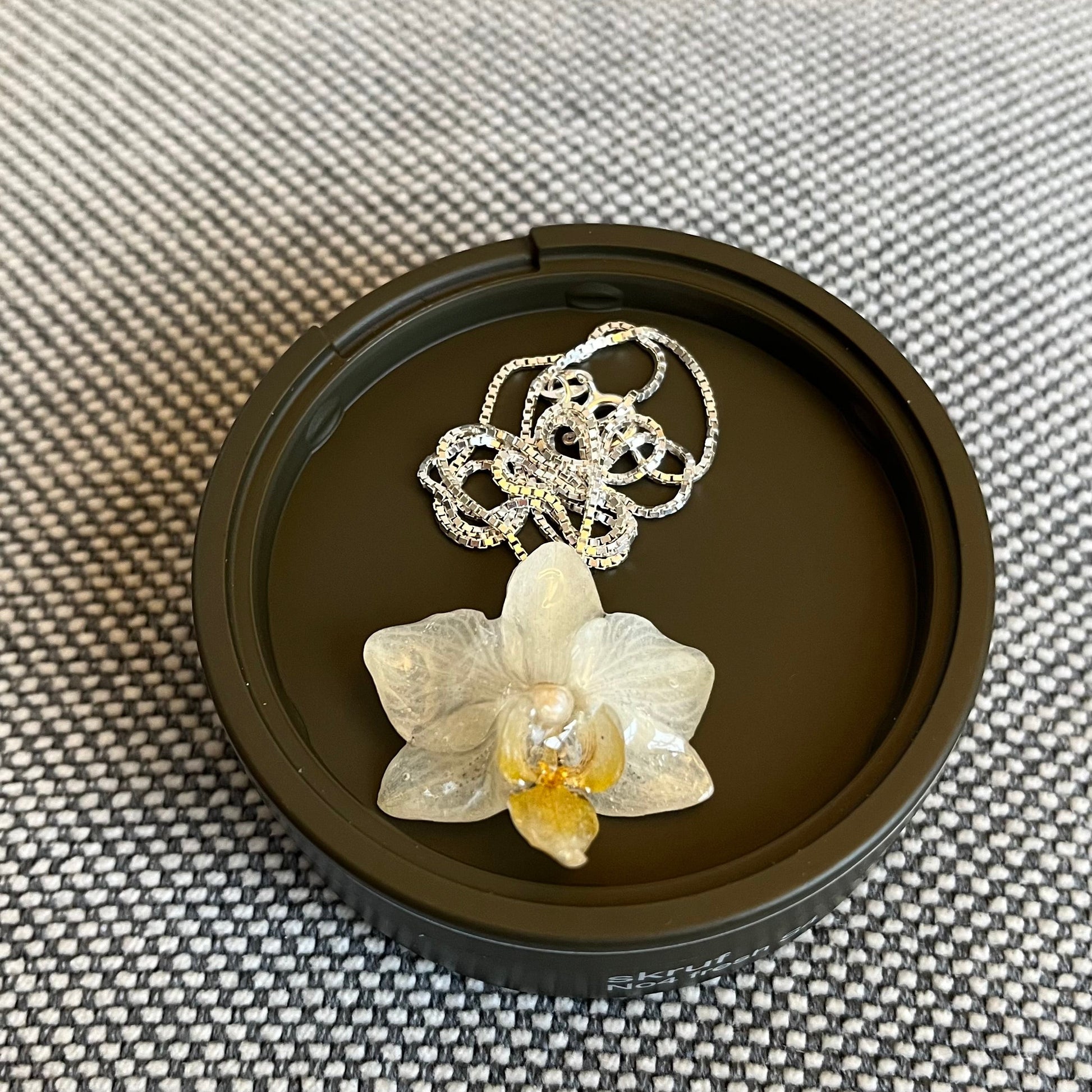 Søkeord: orkidé smykke, orkidé anheng, blomstersmykke, ekte orkidé i kunstharpiks, resin smykke, botanisk kunst smykker, håndlaget smykke, kremfarget smykke, norsk blomsterkunst, KNASK smykker, unik gave, orkidé halskjede
