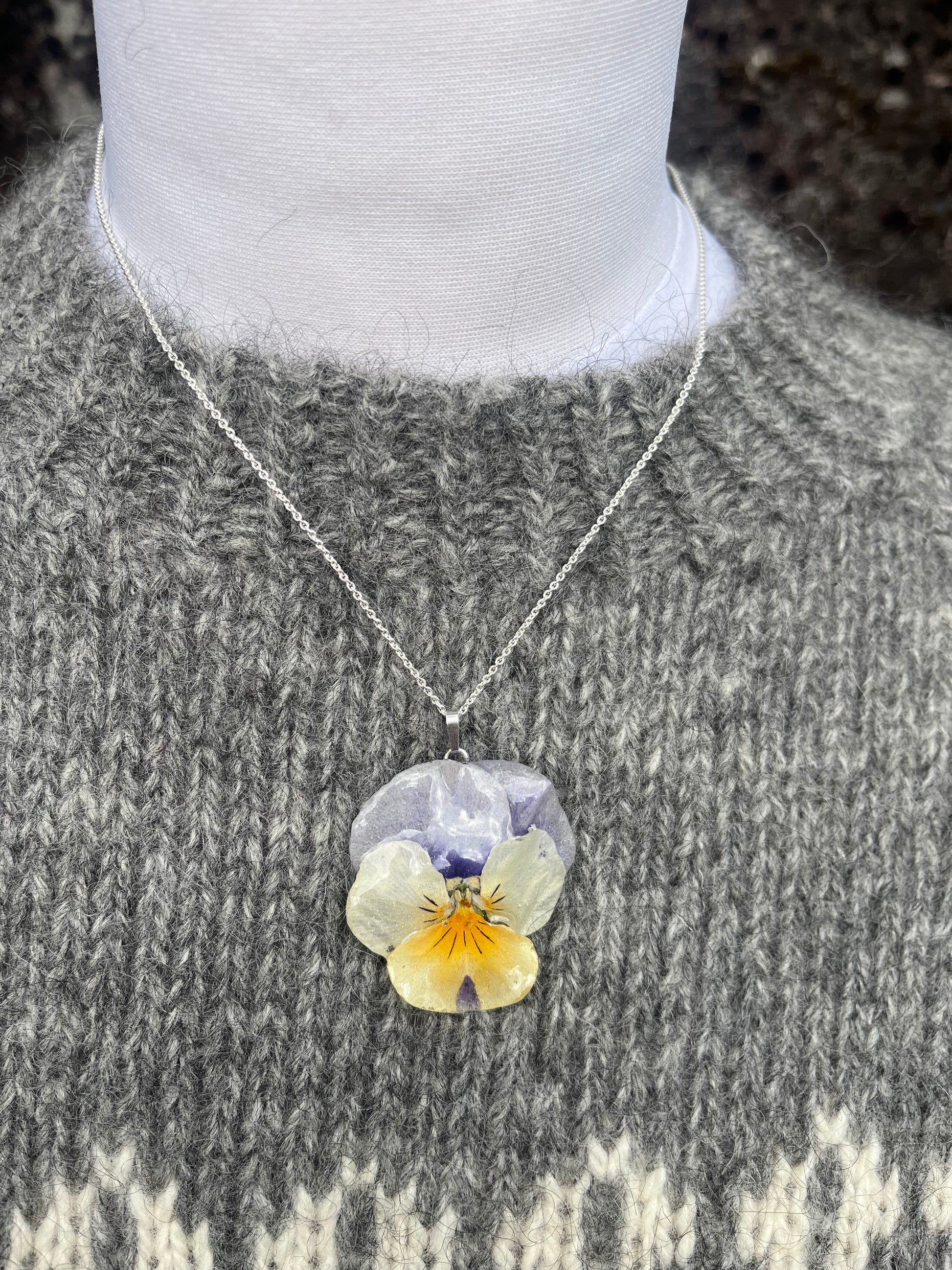 Søkeord: stemorsblomst smykke, viola tricolor smykke, ekte blomster i harpiks, resin flower necklace, botanisk smykke, håndlaget blomstersmykke, klassisk stemorsblomst, lilla og gul blomst, naturinspirert smykkedesign, norsk håndverk, 925 sølv smykke, unikt anheng med blomst, blomstersmykke håndlaget, bærekraftig design, gave til naturelskere, KNASK smykke, blomstersmykke, blomsterkunst