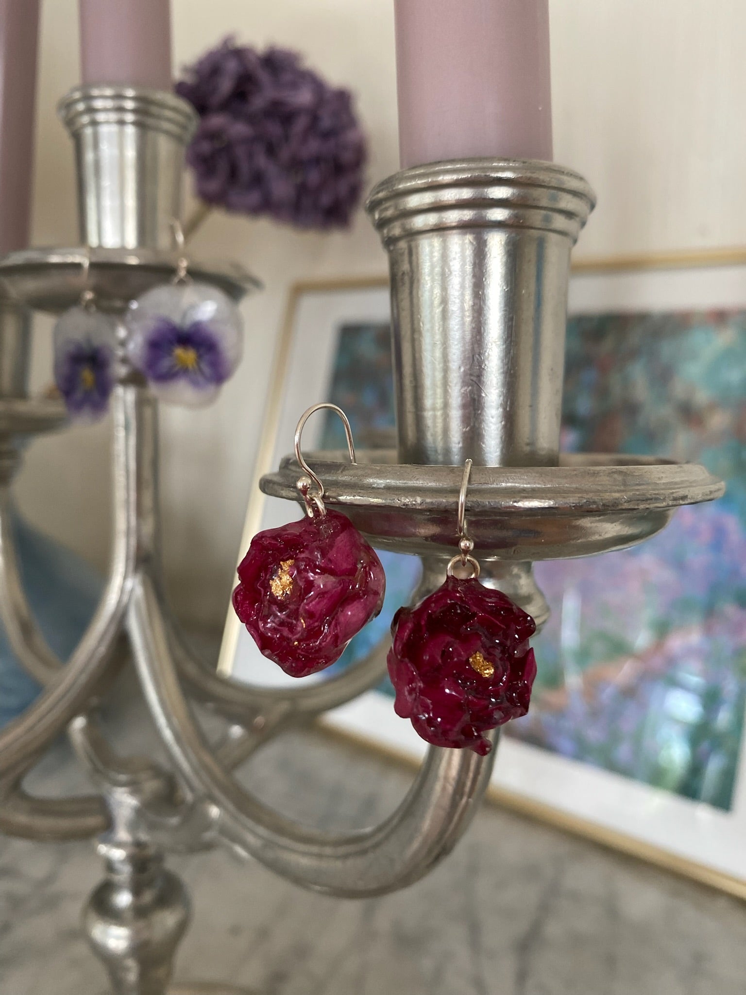 Disse unike øredobbene er laget av ekte roser, 3D-tørket og bevart i glassklar kunstharpiks (resin) med et hint av holografisk glans og gyllen folie i kjernen. Hver blomst er nøye utvalgt for å matche i uttrykk og fargetone – og sammen skaper de et botanisk smykke med naturlig eleganse og en touch av eventyr.