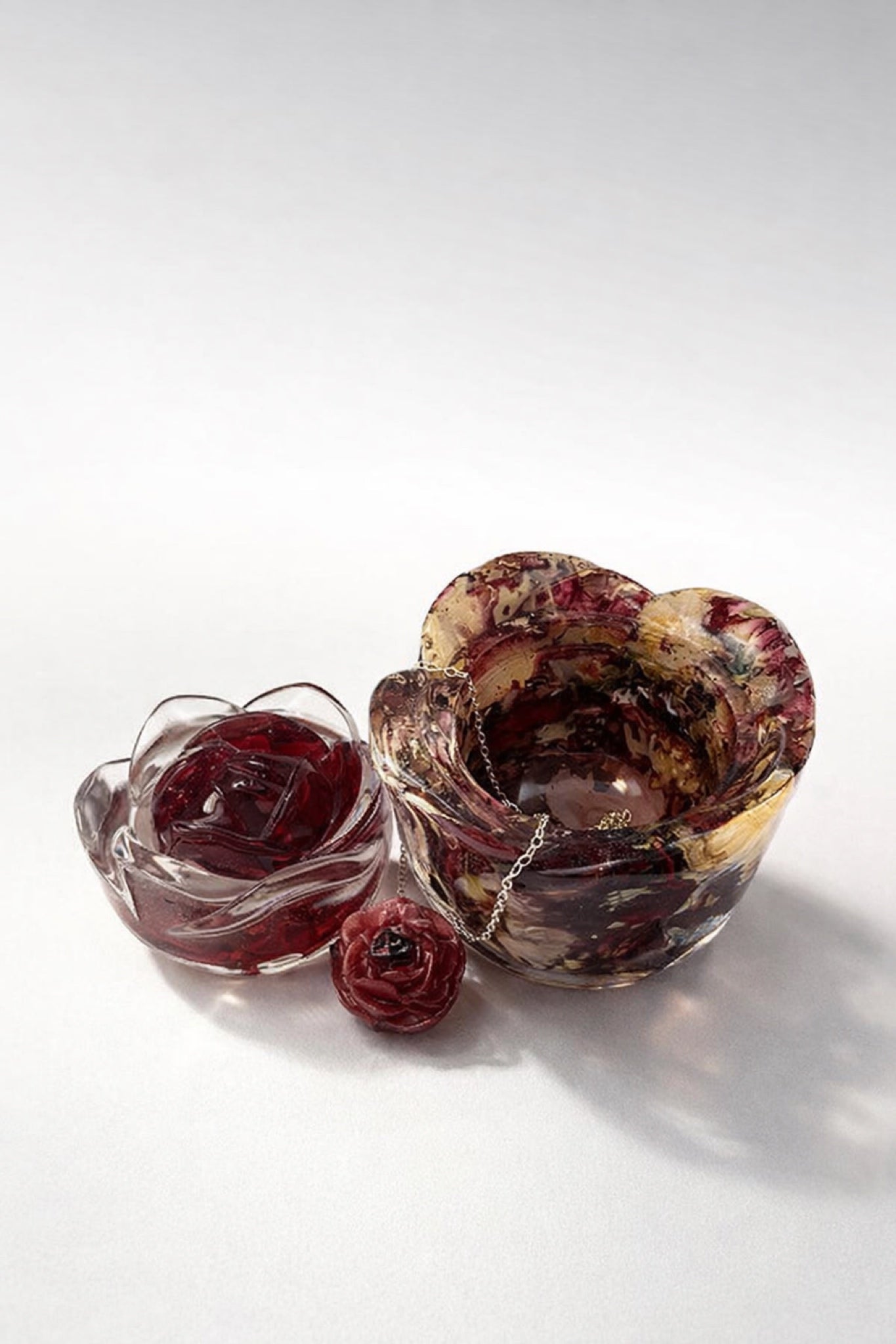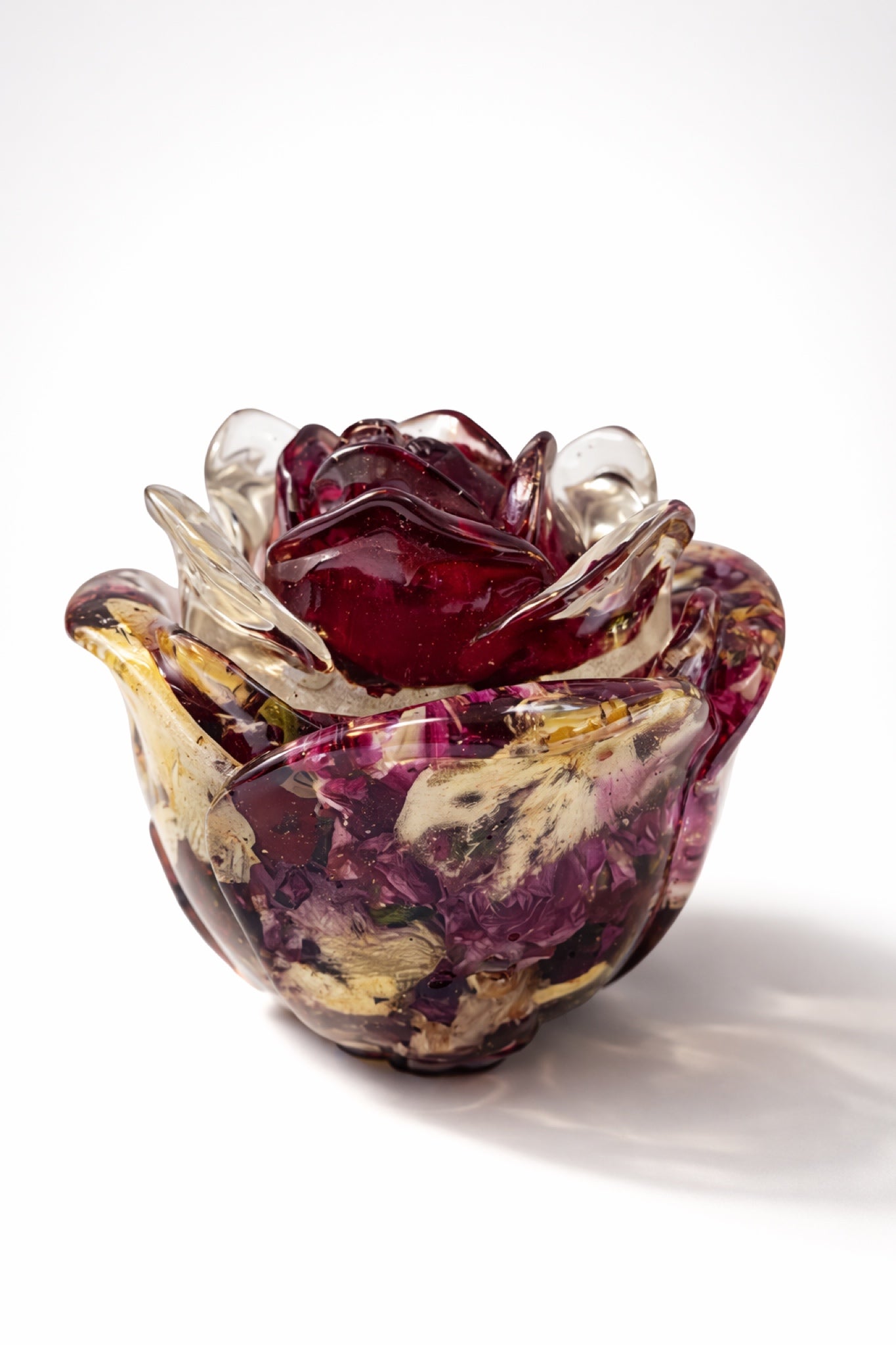 En håndlaget krukke i roseform, fylt med ekte tørkede roser og roseblader i nyanser av gult, rødt og rosa.