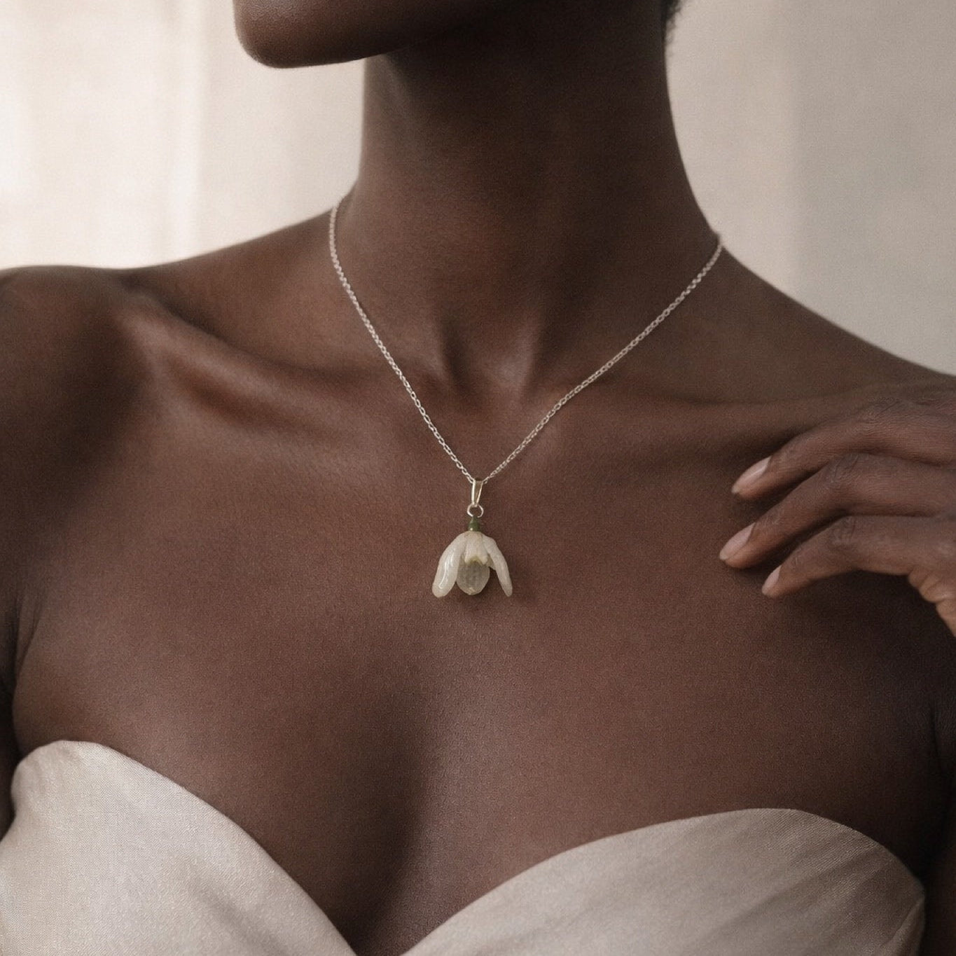 Søkeord: sneklokke smykke, galanthus halskjede, blomstersmykke, ekte sneklokker i kunstharpiks, resin smykke, botanisk kunst smykker, håndlaget halssmykke, 925 sølv kjede, hvite blomstersmykker, vårsmykke, vinterblomst smykke, norsk kunsthåndverk, KNASK smykker, unik gave, minimalistisk blomstersmykke