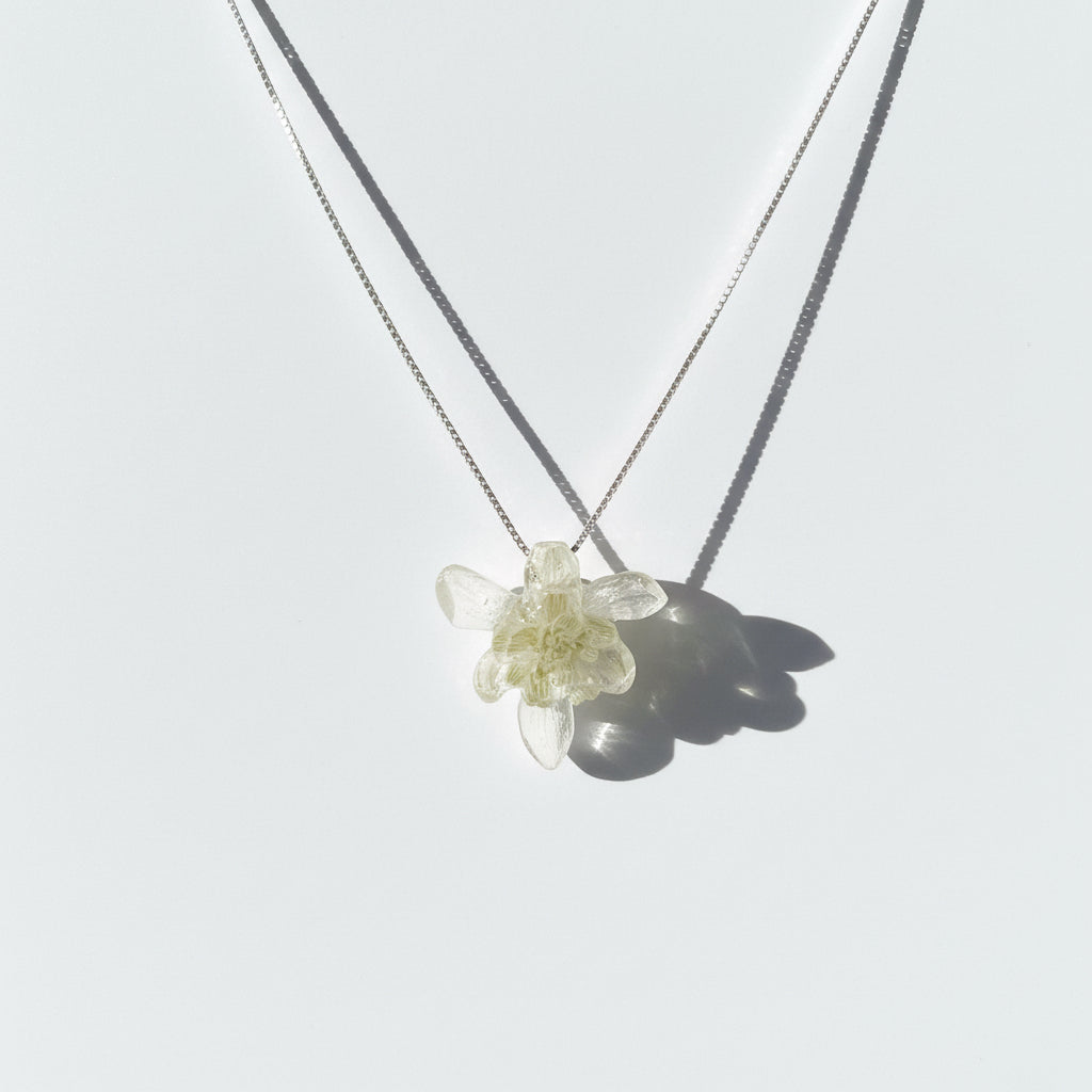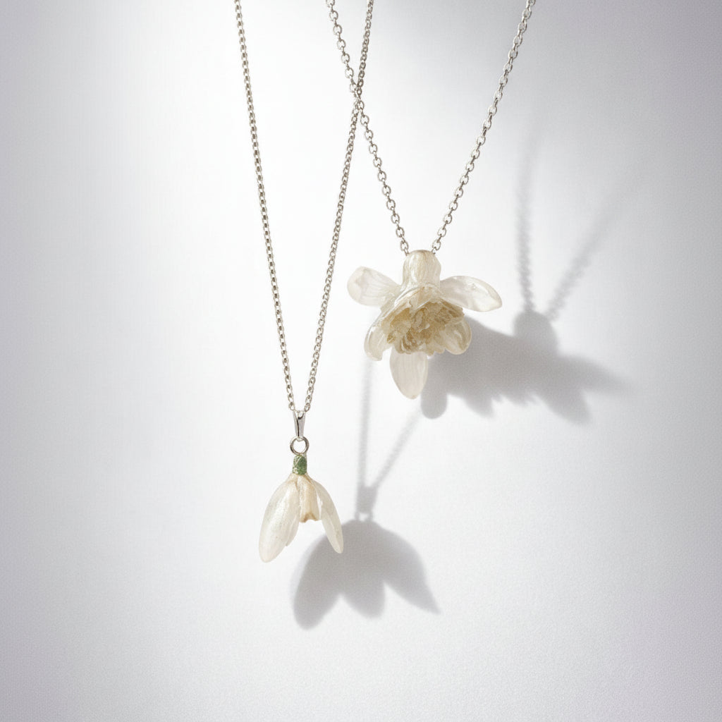 Dette halssmykket er laget av ekte sneklokker (Galanthus), en av årets første vårblomster, kjent for sitt stille, rene og poetiske uttrykk. Blomstene er 3D-tørket for å bevare naturlig form, volum og de karakteristiske buede kronbladene, før de støpes lagvis i krystallklar kunstharpiks (resin). På denne måten kapsles blomsten inn som et lite botanisk kunstverk der struktur, transparens og fargespill får stå i sentrum.