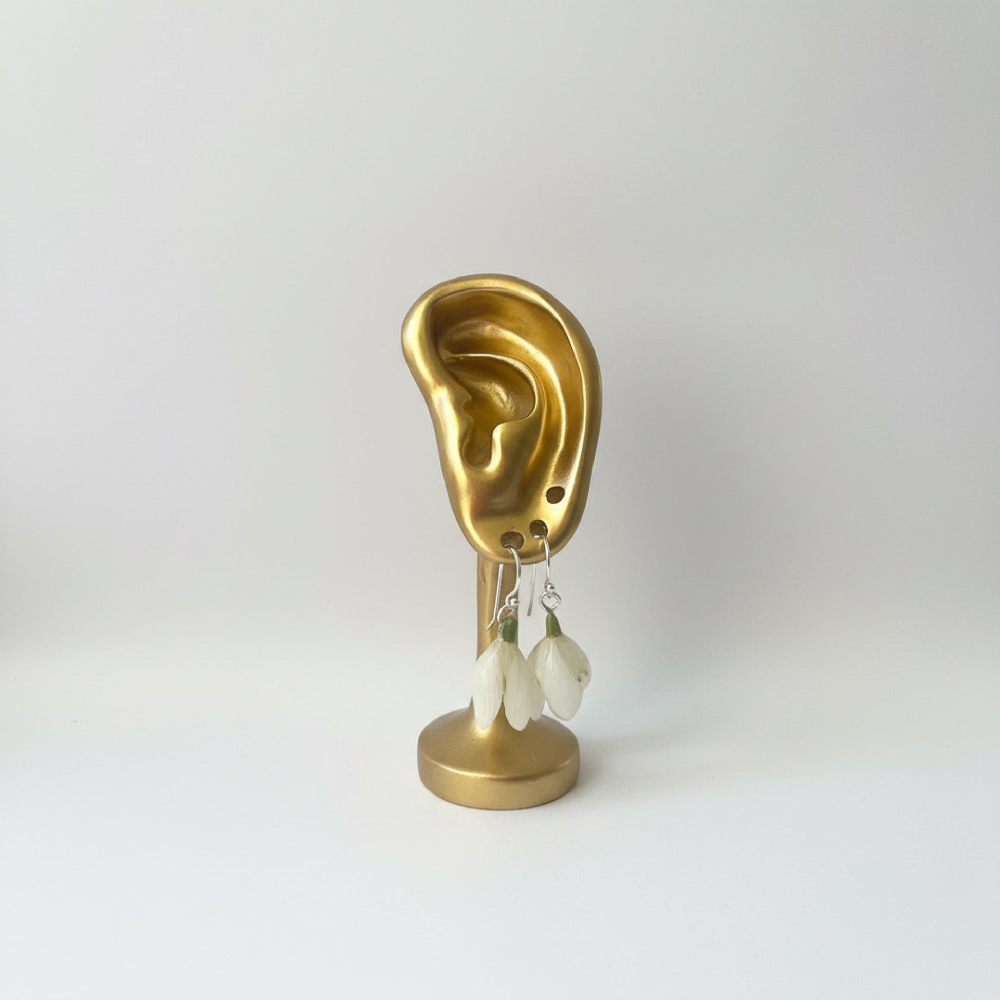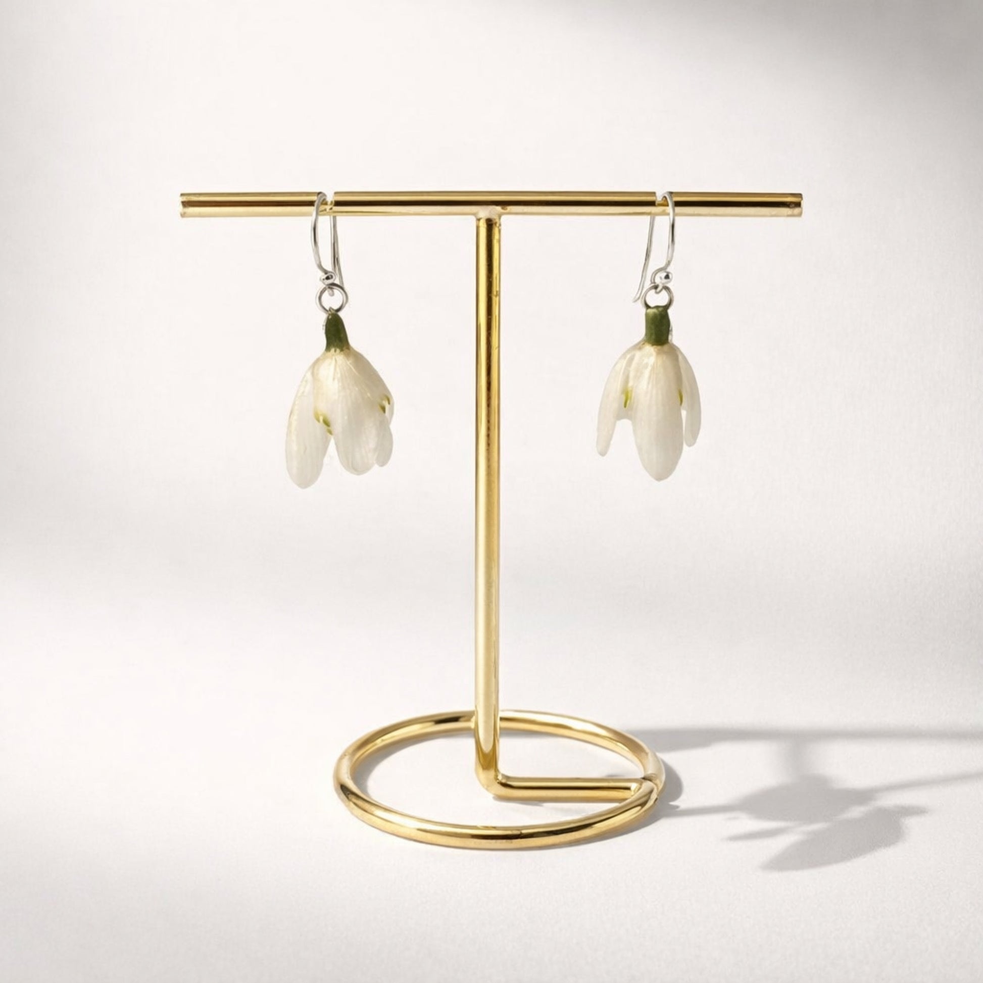 Sneklokkene monteres for hånd på 925 sterling sølv ørekroker, som er nikkelfrie og allergivennlige. Hver blomst velges og kombineres med omtanke for balanse og helhet, men siden materialet er levende og naturlig, vil ingen øredobber bli helt like. Dette er ikke masseproduserte smykker, men små botaniske kunstverk laget én for én.